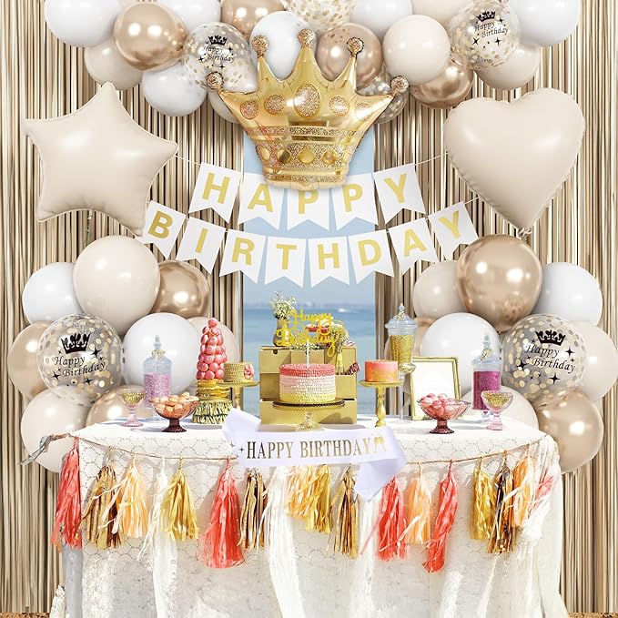 - White Gold Party Decorations - You will get 2pcs 100cm/40inch * 200cm/78.7inch metallic champagne gold foil fringe curtain, 1pc gold white happy birthday banner, 1pc gold birthday cake toppers, 1pc crown foil balloon, 1pc cream star foil balloon, 1pc cream heart foil balloon, 1pc birthday sash, 12inch balloons (10pcs sand white latex balloons, 8pcs metallic champagne gold balloons, 8pcs white balloons, 4pcs gold confetti party balloons, 4pcs gold print balloons), 1pc balloon ribbon.