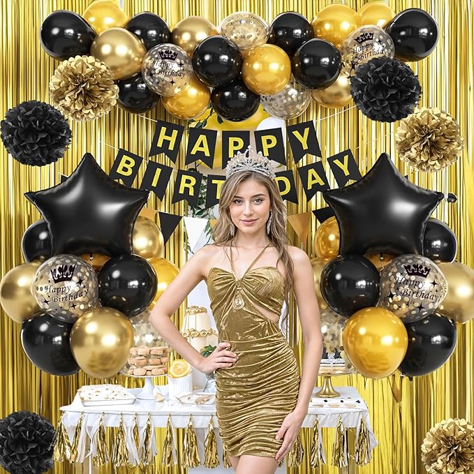 - Black And Gold Party Decorations - You will get 1pc 100cm/40inch * 200cm/78.7inch metallic gold foil fringe curtain, 3pcs black pom poms, 3pcs gold pom poms, black gold happy birthday banner, happy birthday buntting, 2pcs 18inch black star foil balloon, 12inch balloons ( 4pcs gold confetti latex balloons, 4pcs gold confetti print balloons, 4pcs gold helium balloons, 4pcs pearl gold party balloons, 4pcs black balloons), 1pc balloon ribbon.