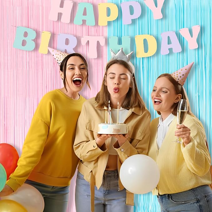 BRAVESHINE Tinsel Photo Backdrop Curtains - 2 Pack 3.2x8.2ft Pastel Pink Blue Foil Fringe Streamer Curtain for Christmas/Boy or Girl Birthdays/Mermaid/Candy/Donuts/Easter/Engagement Party Decorations