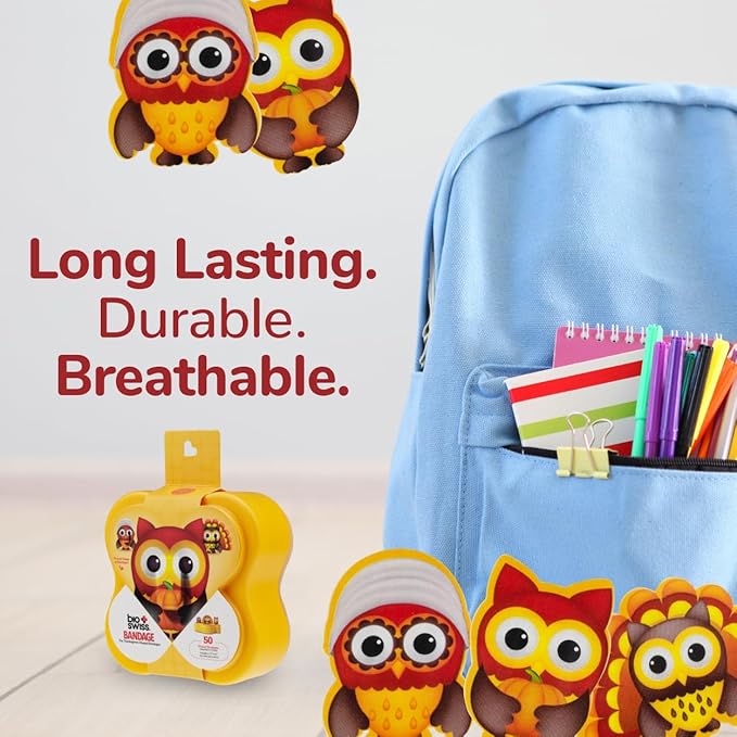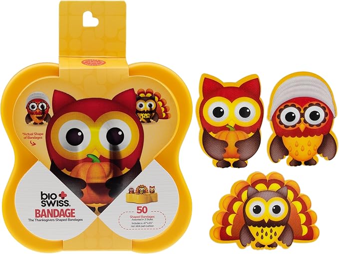 - 50 THANKSGIVING KIDS BANDAGES: Fun Thanksgiving owl-shaped adhesive bandages plastic box helps protect cuts, scrapes, and minor wounds while making healing less stressful for children; bandages come in 3 assorted styles