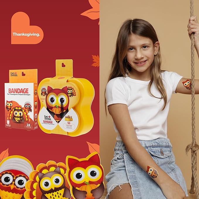 BioSwiss Kids Bandages, Thanksgiving Shaped Self Adhesive Bandage Set, Latex Free, Sterile Wound Care, 50 Count