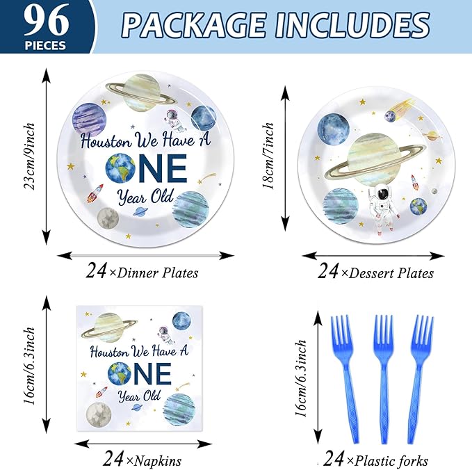 - Serves 24 Guests:This outer space 1st birthday party tableware supplies includes 24 paper plates (7"),24 paper plates (9"),24 napkins (6.3") and 24 forks.The space theme 1st birthday party plates and napkins can serve for 24 guests.