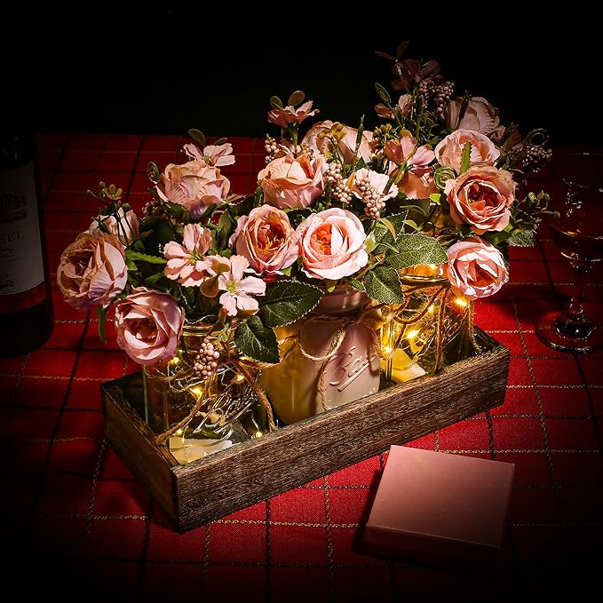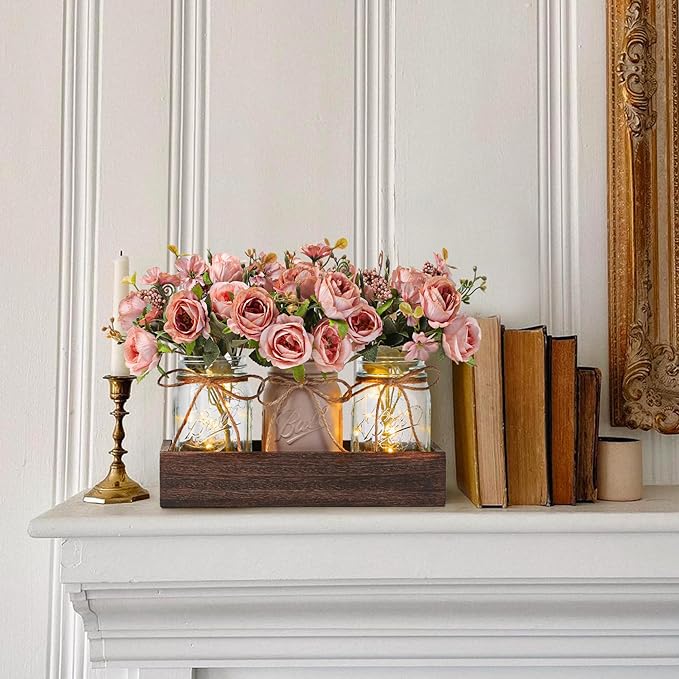 3 Pcs Mason Jar Centerpiece Table Decorations for Dining Table Decor Farmhouse Coffee Table Decor with Wood Tray and Led Light Table Centerpieces for Dining Room Kitchen Living Bathroom,Pink