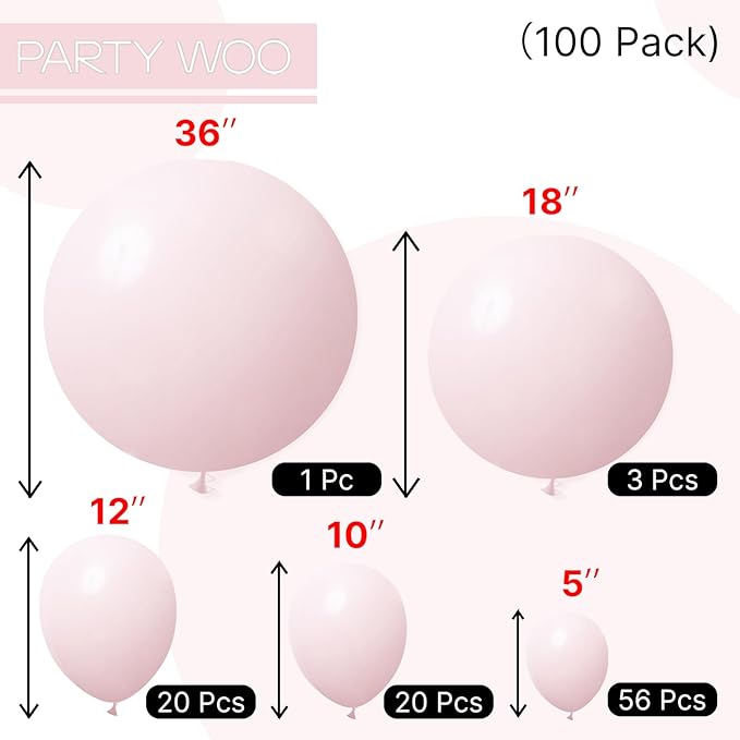- Package includes: 36 inch pale pink balloons (1 pcs), 18 inch pale pink balloons (3 pcs), 12 inch pale pink balloons (20 pcs), 10 inch (20 pcs), 5 inch (56 pcs), pay attentions that these 5 inch balloons could NOT float when inflated with HELIUM.