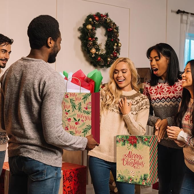 - High Quality: The bulk holiday gift bags are made from high-quality, thick kraft paper and feature paper twist handles. Each bag also includes a sturdy cardboard-reinforced bottom, ensuring they are robust enough to carry a variety of gifts, such as toys and books.