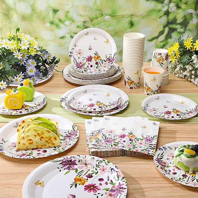 Hsei 250 Pcs Spring Wildflower Party Decoration Baby Shower Disposable Tableware Sets Birthday Supplies Serves 50 Guests Disposable Plates Napkins and Cups for Baby Bridal Shower Birthday Party