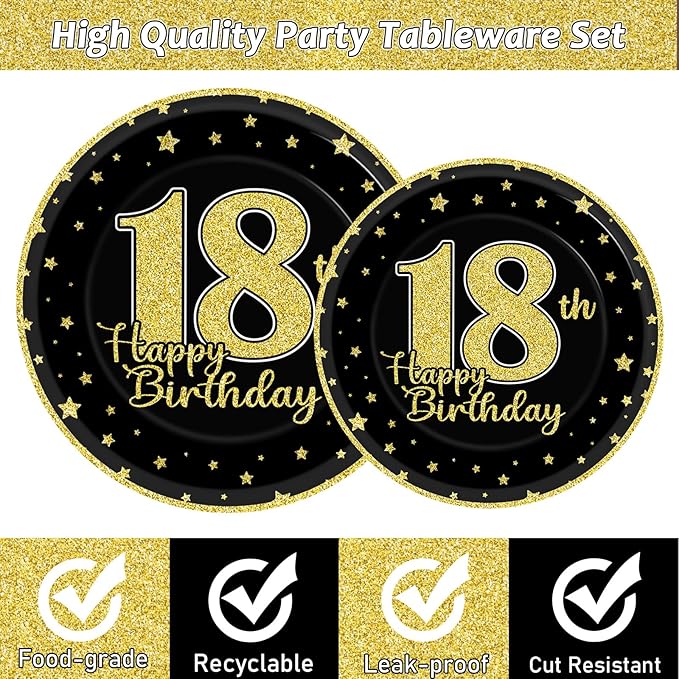 - Black and gold 18th design: elegant design with black gold 18th birthday party elements, like confetti, large letters, etc., make a memorable and meaningful party with 18th birthday party tableware.