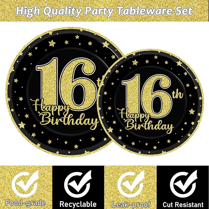 - Black and gold 16th birthday decorations: elegant design with black gold 16th birthday party elements, designed with patterns like confetti, large letters, etc., make a memorable and meaningful party with this exquisite 16th birthday party tableware.