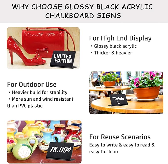 - Why Choose Acrylic Mini Chalkboard Signs: Reusable, thicker, heavier, more stable, and higher-end than paper cards or PVC plastic signs.
