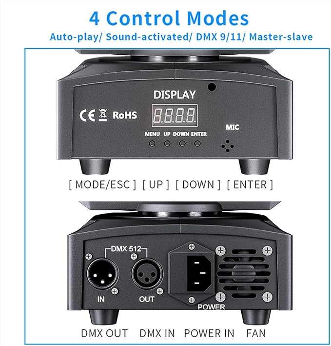 - 【Multiple Control Modes】Each light supports 5 control modes: DMX 512, Sound Activated, Auto, Master/Slave, and Strobe. Whether you prefer manual control via DMX, automatic pre-set programs, or sound-responsive effects synced with music, these lights provide the flexibility to suit any event