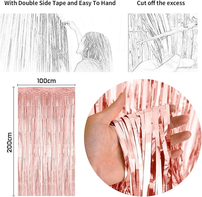 - π Rose Gold Party Decorations - You will get 2pcs 1m * 2m rose gold foil fringe curtain, 1pc rose gold birthday sash, 1pc rosegold birthday cake toppers, 1pc 18inch heart foil balloon, 1pcs 18inch star foil balloons, 1pc large crown foil balloon, 1pc happy birthday banner rose gold, 12inch balloons ( 8pcs rosegold latex balloons, 8pcs metallic rosegold helium balloons, 10pcs black party balloons, 4pcs rosegold confetti party balloons, 4pcs rosegold print balloons), 1pc balloon ribbon.