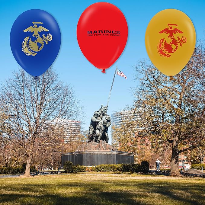 U.S. Marines Party Balloons (10pcs) 12” Latex Balloons in Red, Gold, and Blue with contrasting print on 2 sides. Officially Licensed by the U.S.Marines - Made in Italy - by Havercamp.