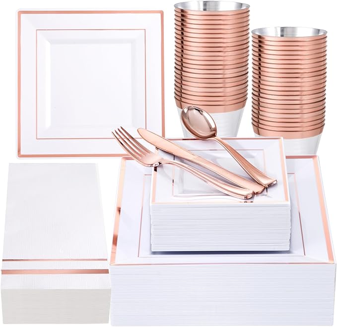 - EXQUISITE DESIGN: This rose gold square plastic plates set includes 50pcs 9.5" rose gold dinner plates, 50pcs 6" rose gold dessert plates, 50 sets of rose gold plastic cutlery, 50 rose gold plastic cups and 50 paper napkins, each rose gold plates and napkins party supplies has a beautiful rose gold rim design, adding a luxurious touch to the dining occasion.