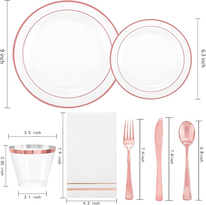 - EXQUISITE SET : GATHER rose gold plastic plates contain 50 9inch rose gold dinner plates, 50 6.3inch rose gold dessert plates, 150 disposable rose gold silverware, 50 rose gold rimmed plastic cups, 50 napkins, you can serve 50 guests, you don't need to buy anything else, this rose gold dinnerware will be enough for you.