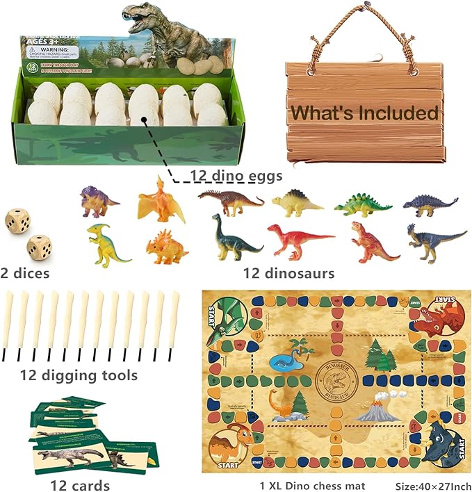 - 【 What You Get 】 The dinosaur dig kit includes 12 dinosaur fossil eggs, 12 chisel/brushes, 12 dinosaur knowledge cards, 2 dices and 1 XL dinosaur chess play mat.