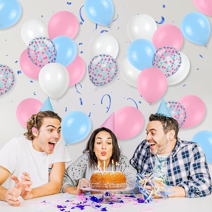 - 12 Inch blue and pink balloons: Package content includes 9 pcs blue balloons, 5 pcs confetti blue pink balloons, 9 pcs pink balloons,7 pcs white balloons, a balloon ribbon.The color combination meets all your party imagination.