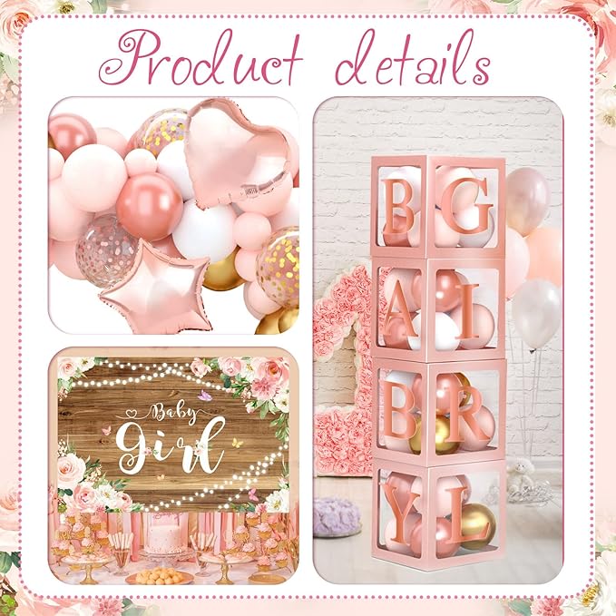 - Premium Quality: Every shipment is carefully checked by our warehouse staff. The 4pcs rose gold baby balloon boxes with letters for girl baby shower is easy to assemble, reusable and foldable,made of high-quality cardboard and transparent plastic.And transform any event space into a stunning display of color with our high-quality pink/rose gold balloons that not easy to break and durable and come in a variety of beautiful shades.A beautifully designed baby girl background is also sure to please!