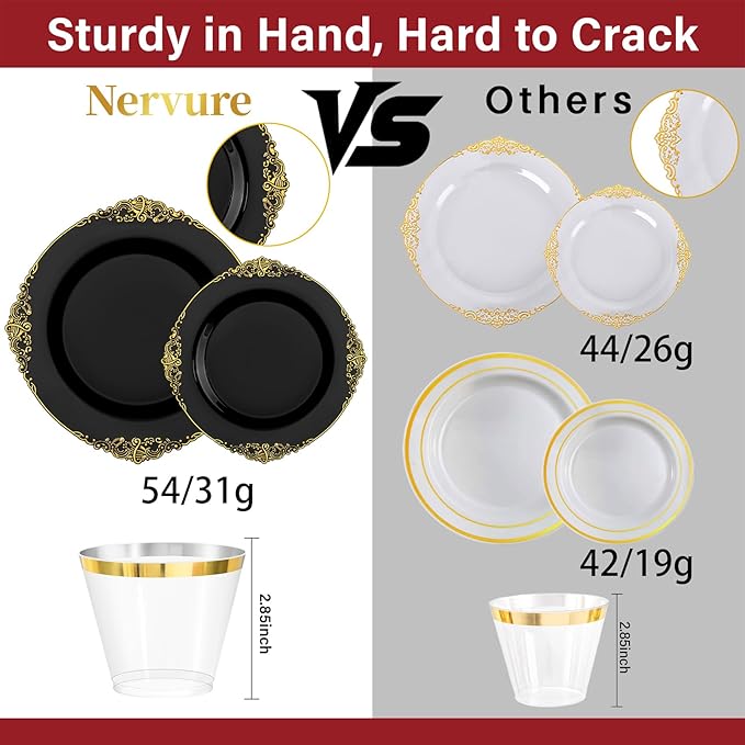- Great Value: Although intended for single-use, these Baroque-styled black disposable plates offer a cost-effective alternative compared to traditional porcelain. Catering to gatherings of up to 25 guests, our black plastic plates include dinner plates and dessert plates, knives, forks, spoons, tissues, and cups, ensuring every guest has everything they need for a delightful dining experience.