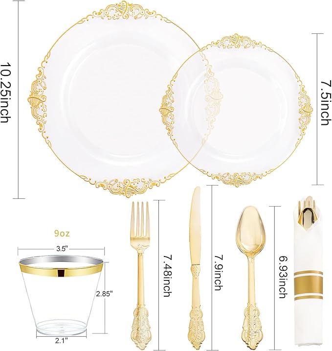 - Great Value: Although intended for single-use, these Baroque-styled clear disposable plates offer a cost-effective alternative compared to traditional porcelain. Catering to gatherings of up to 25 guests, our clear plastic plates include dinner plates and dessert plates, knives, forks, spoons, tissues, and cups, ensuring every guest has everything they need for a delightful dining experience.