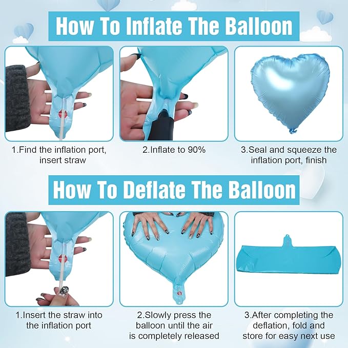 - EASY TO USE:These helium polyester film heart balloons can be filled with air or helium and inflated up to 90% to prevent them from getting too big and exploding. The set comes with a straw and ribbon, after the party is over, use the straw to deflate by inserting it into the inflation port, balloons can be reused