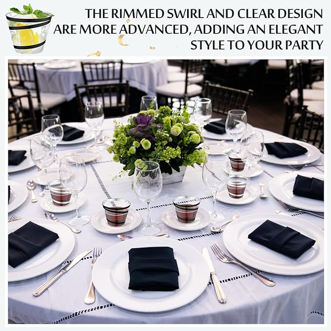 - Elegant and Exquisite Design: the elegant trim swirl around our 9 ounce clear plastic cups add a touch of elegance to your table in party or home kitchen and leave your guest a good impression with these exquisite plastic cups
