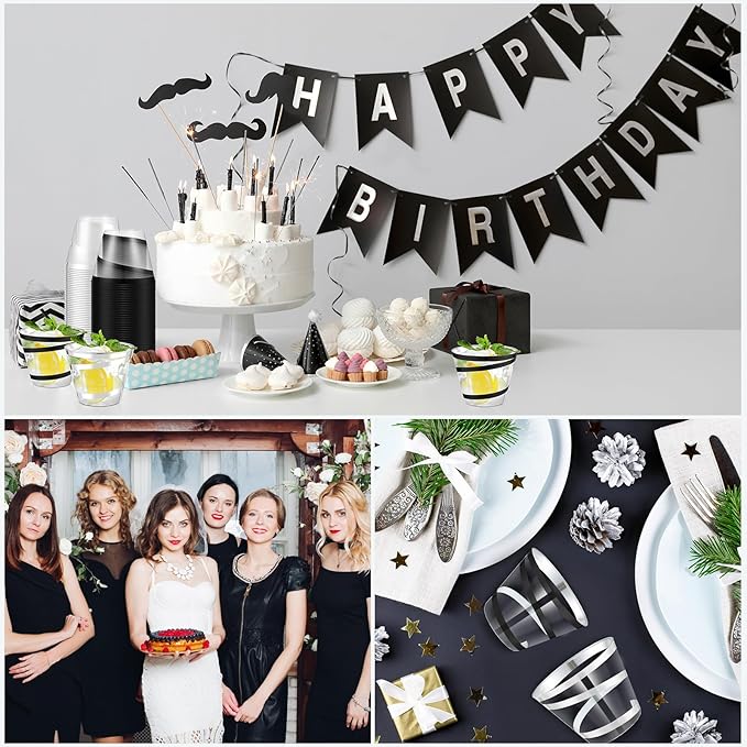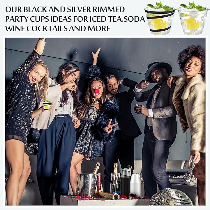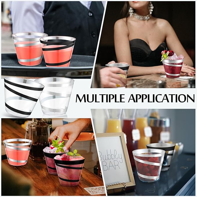 Gejoy 9 oz Rimmed Swirl Plastic Cups Disposable Wine Drinking Cups Clear Elegant Halloween Tumblers for Christmas Party Supplies(Silver, Black,100 Pcs)
