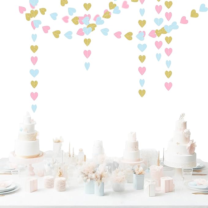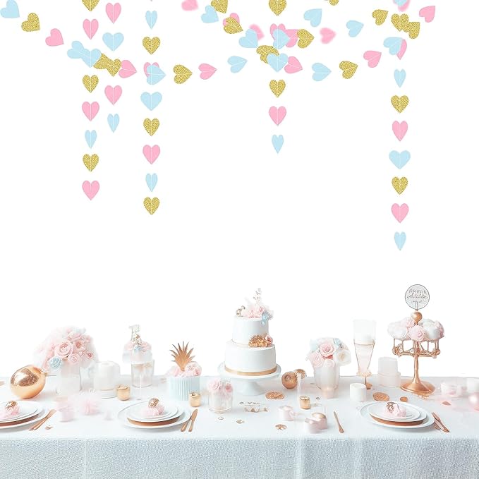 Blue Pink Gold Party-Decorations Gender-Reveal - 52Ft Paper Heart Streamers Garland Banner Hanging Decor Birthday Ideas Event Party Supplies