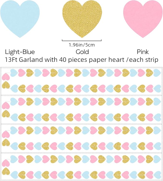 - 【Package Including】The decorations kit include 4 pack paper heart garland in 3 colors Blue,Gold,Pink,each garland is approx 13 feet in length,totally 52 feet in length.Each one has 40 pieces paper heart.