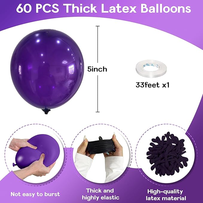 - π Round Balloons Set Includes - Each mini balloon kit contains 60pcs royal purple 5 inch balloons for balloon arch kit balloon garland decorations and 1pc purple balloon ribbon (total of 33 feet). The right quantity of party balloons and the most suitable color allow you to create a visually striking and captivating atmosphere that will leave your guests in awe.