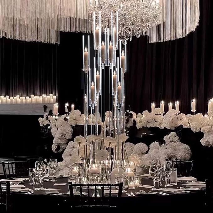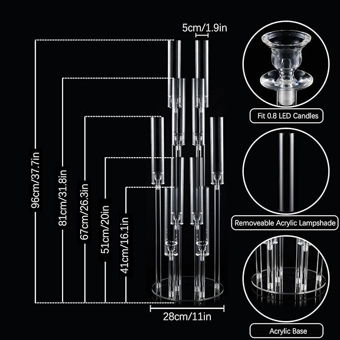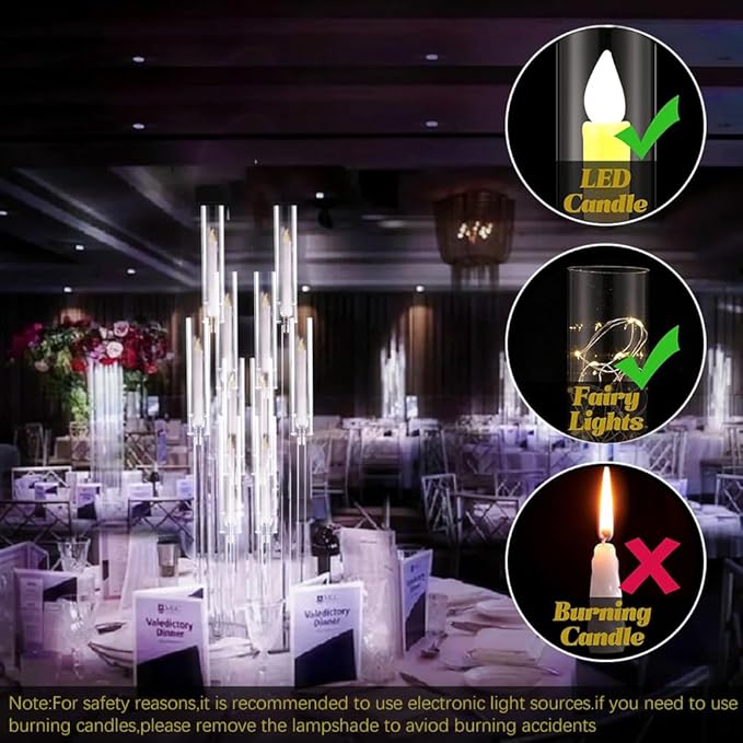 - 【Easy to Assemble】: Installation is simple, just screw the 10 solid acrylic rods into the chassis, and then tighten the 10 candle cup threads with the tall rod; then install the silver feet and lampshade to complete the installation, After installation, the structure is stable and durable; It is recommended to use electronic candles for tall candle holders to ensure safety, detachable design ensures safe transportation and saves space
