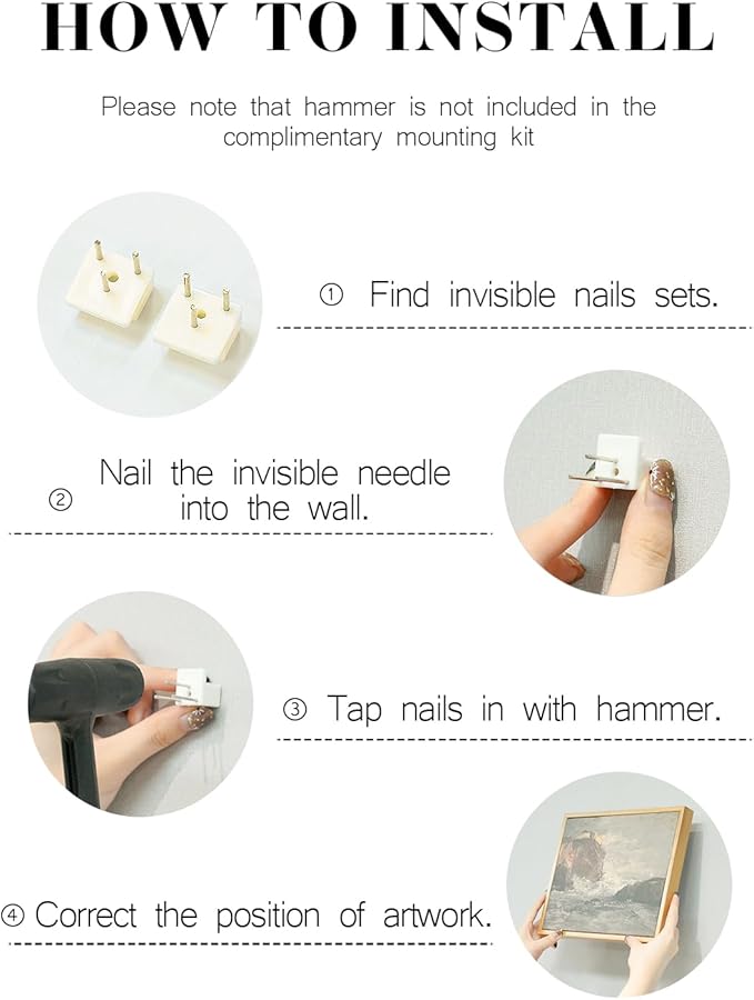 - Ready To Hang : This framed canvas art wall decor measures 12x16 inches, comes with 2 invisible nails which makes it easy to hang. Please read the installation instruction image before nailing the hook on your wall. (This item is handmade, so please allow the size error to be about 0.2 inches)