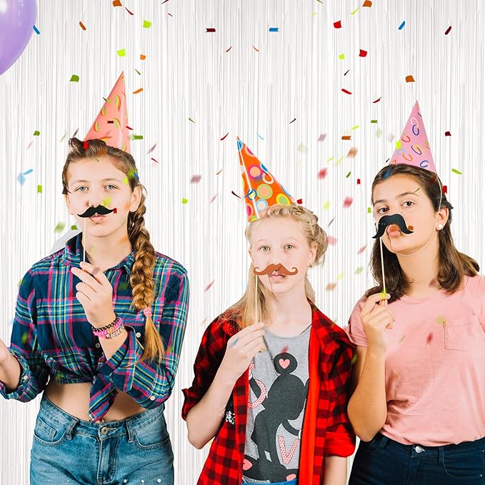 - Premium Quality: Crafted from shiny PET tinsel, these white fringe curtains are designed to be light weight, easy to hang, and resistant to wear and tear. The metallic party streamers reflect light beautifully, creating a mesmerizing visual effect