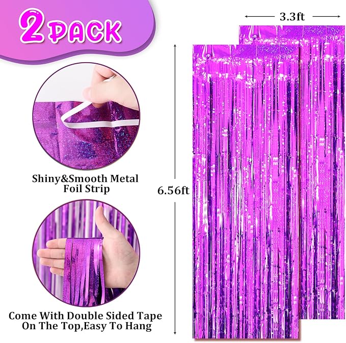 - Stunning Decorative Set: You'll receive 2 pcs laser purple foil fringe backdrop curtains, each measuring 3.28 ft (wide)×6.56 ft (drop). Enough length foil fringe curtains backdrops are perfect for the door or wall to create an impressive decoration