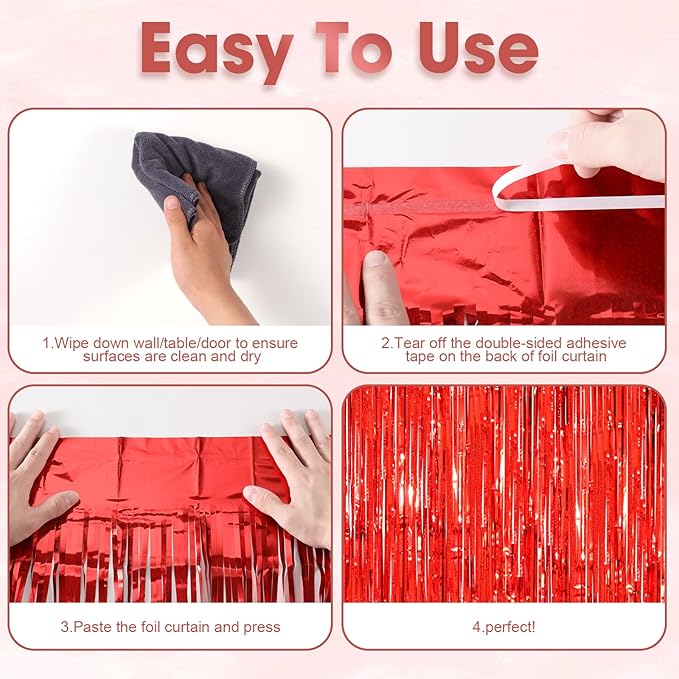 - How to Set up: Wipe down wall/table/door, ensure surfaces are clean and dry, tear off the double-sided adhesive tape, paste the foil backdrop curtains and press. Hang each individual tinsel fringe curtains in different locations for a fuller effect
