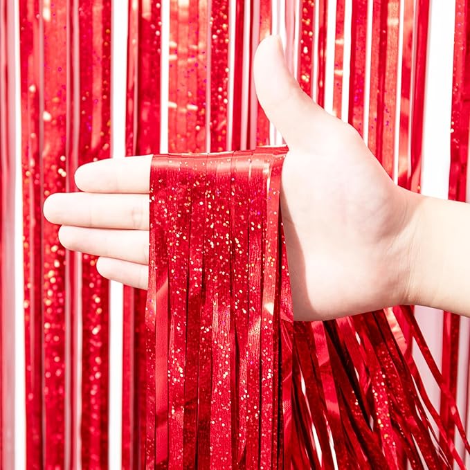 - Stunning Decorative Set: You'll receive 2 pcs laser red foil fringe backdrop curtains, each measuring 3.28 ft (wide)×6.56 ft (drop). Enough length foil fringe curtains backdrops are perfect for the door or wall to create an impressive decoration