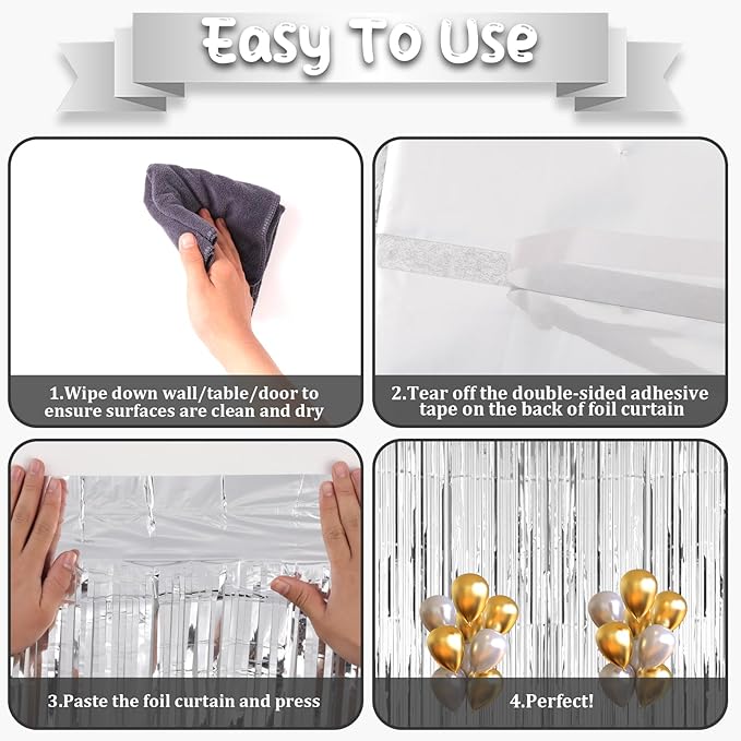 - How to Set up: Wipe down wall/table/door, ensure surfaces are clean and dry, tear off the double-sided adhesive tape, paste the foil backdrop curtains and press. Hang each individual tinsel fringe curtains in different locations for a fuller effect