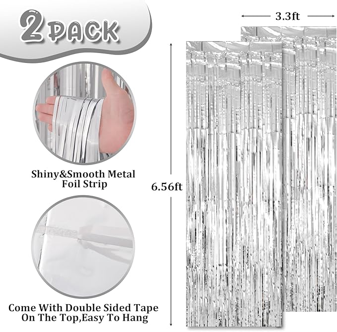 - Stunning Decorative Set: You'll receive 2 pcs laser silver foil fringe backdrop curtains, each measuring 3.28 ft (wide)×6.56 ft (drop). Enough length foil fringe curtains backdrops are perfect for the door or wall to create an impressive decoration