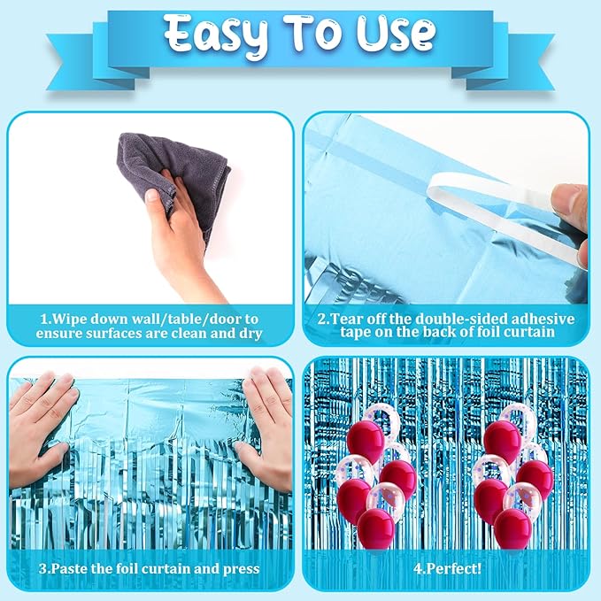 - How to Set up: Wipe down wall/table/door, ensure surfaces are clean and dry, tear off the double-sided adhesive tape, paste the foil backdrop curtains and press. Hang each individual tinsel fringe curtains in different locations for a fuller effect