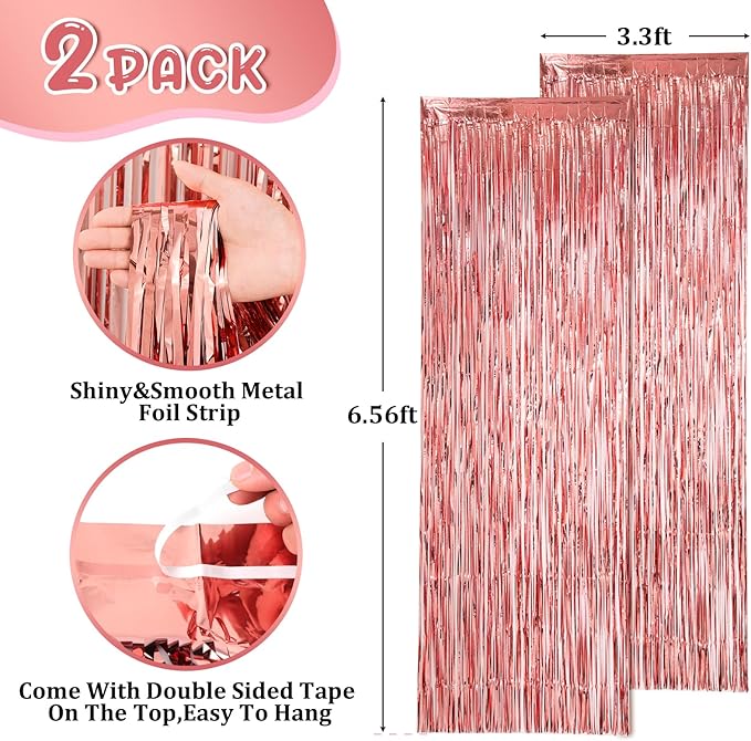 - Stunning Decorative Set: You'll receive 2 pcs rose gold foil fringe backdrop curtains, each measuring 3.28 ft (wide)×6.56 ft (drop). Enough length foil fringe curtains backdrops are perfect for the door or wall to create an impressive decoration