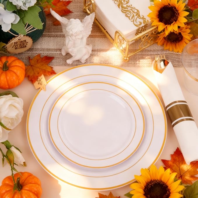 - VERSATILE AND FESTIVE: These white and gold plates disposable are perfect for various occasions, from intimate gatherings to larger celebrations. Whether youβre hosting a formal dinner party or a casual festival feast, this set enhances the dining experience and adds a festive touch to your table.