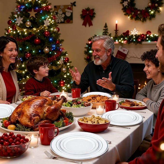 - VERSATILE AND FESTIVE: These white and silver plates disposable are perfect for various occasions, from intimate gatherings to larger celebrations. Whether youβre hosting a formal dinner party or a casual festival feast, this set enhances the dining experience and adds a festive touch to your table.