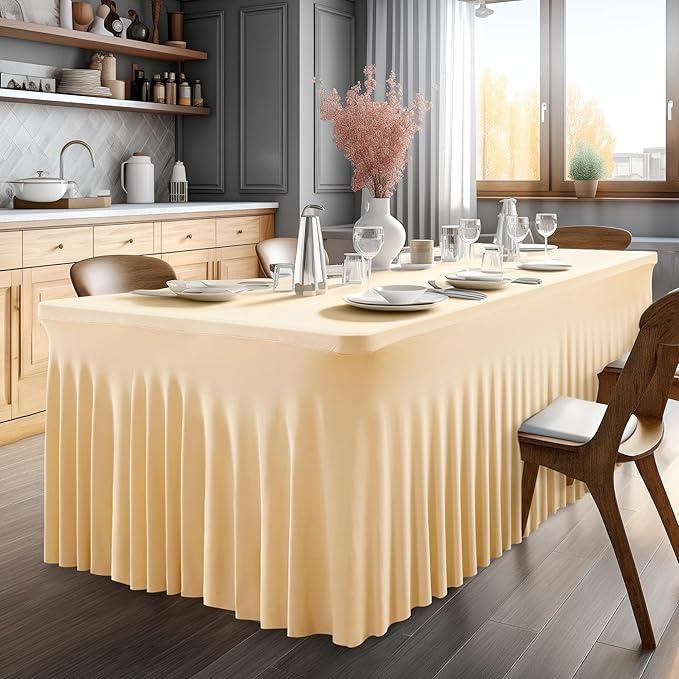 - 【Good Spandex Table Cover】 - This table cloth with skirt are made from 90% polyester material and 10% spandex fabric, which is stretchable, sturdy. The elasticized design ensures a snug fit on the table, preventing any movement or slipping during use. It is also reusable and will look as good as new every time it is used for any occasion or party. Enjoy the convenience of a versatile, elegant and practical tablecloth that adds a touch of sophistication to your event decor.