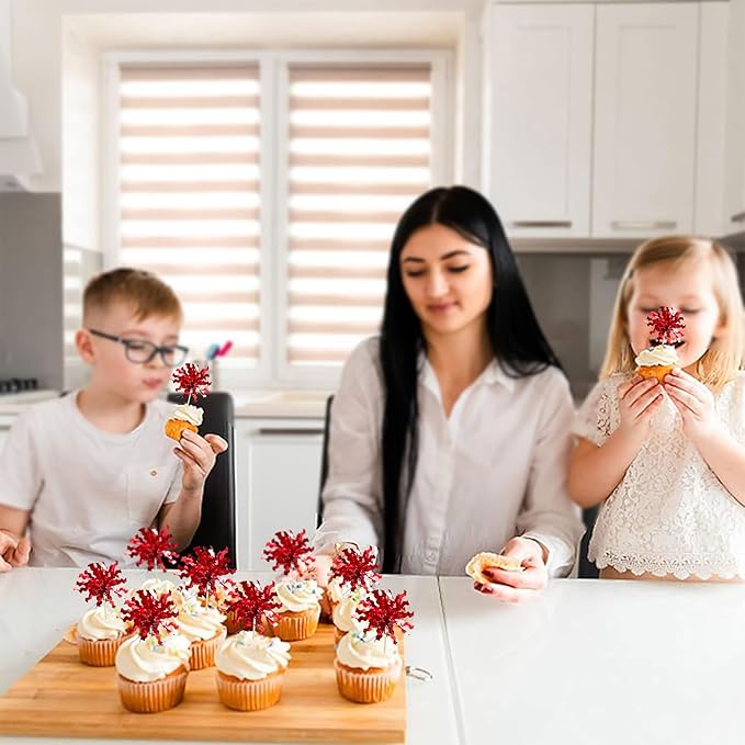 Gyufise 30Pcs Foil Firework Cupcake Toppers Sparkle Tinsel Cake Toppers Tinsel Drink Cake Decoration Cocktail Picks for Birthday Wedding Graduation Party Supplies Red
