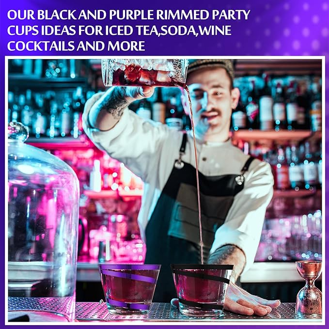Gejoy 9 oz Rimmed Swirl Plastic Cups Disposable Wine Drinking Cups Clear Elegant Halloween Tumblers for Christmas Party Supplies(Purple, Black,100 Pcs)