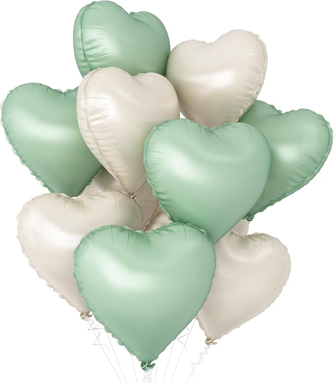- 10PCS HEART BALLOONS:You will get 5pcs 18Inch olive green heart balloons,5pcs 18Inch cream white heart balloons,ribbon.The sage green cream white heart shaped balloons suitable for any party, can leave unforgettable memories for the guests attending the party, 18Inch is large enough to better embellish your party.