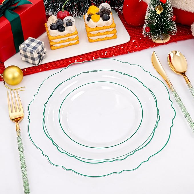 - PERFECT FOR ANY OCCASION :Whether Weddings, Birthdays, picnics, Christmas or family gatherings,our green disposable dinnerware set elevates your event.Lightweight and elegant, the clear and green plastic plates are both convenient and beautiful for a hassle-free celebration!
