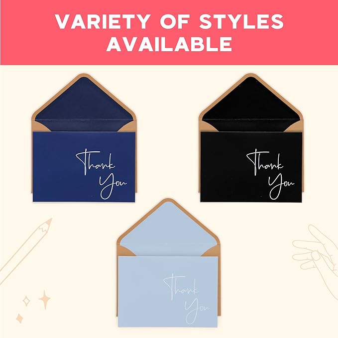 - Classy design for any occasion: Each box set of 20 thank you cards come with matching lick-to-seal sturdy kraft envelopes with a blue interior lining as well as a matching themed sticker to seal the envelope and tie it all together. Be sure to always have a pack of greeting cards on hand, whether you need to thank a friend, send a special note, or make some staff appreciation cards!