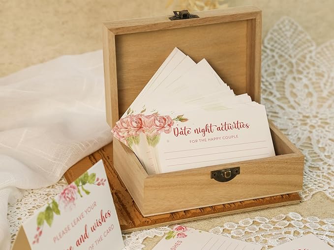 - Set Includes: The wedding shower games for reception set includes 1 wooden box measures 6x4x2.7" as wedding advice box, 50 cards with wedding wishes cards on the front, date night activities on the back, a folded instruction for bridal shower decor
