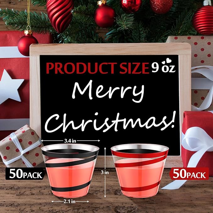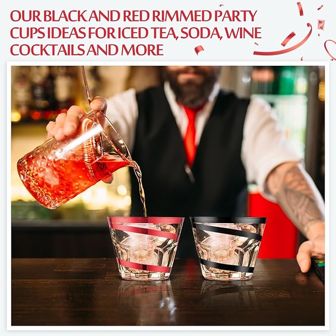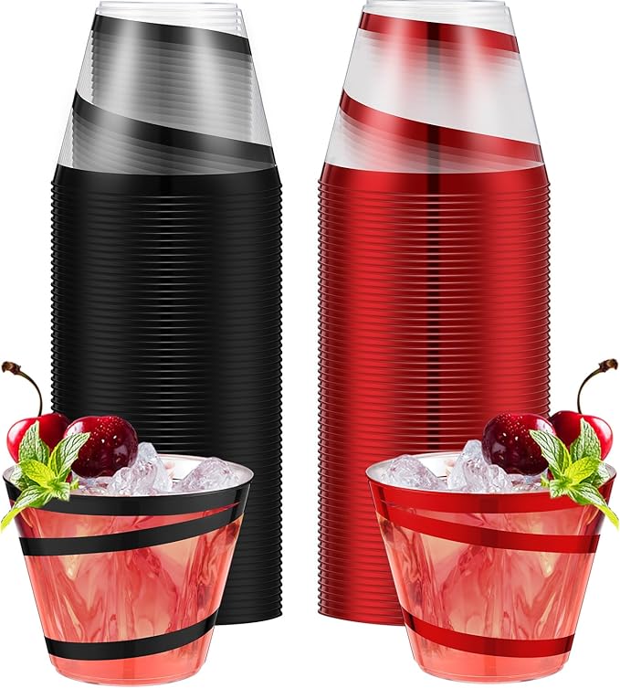 Gejoy 9 oz Rimmed Swirl Plastic Cups Disposable Wine Drinking Cups Clear Elegant Halloween Tumblers for Christmas Party Supplies(Red, Black,100 Pcs)