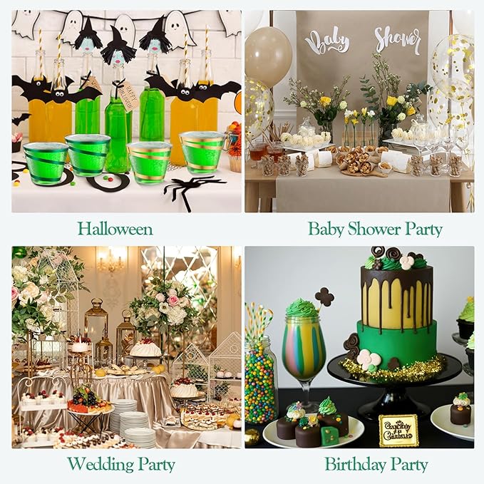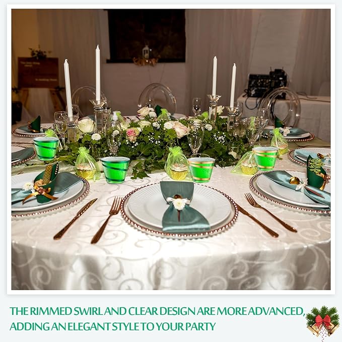 Gejoy 9 oz Rimmed Swirl Plastic Cups Disposable Wine Drinking Cups Clear Elegant Halloween Tumblers for Christmas Party Supplies(Gold, Green,100 Pcs)